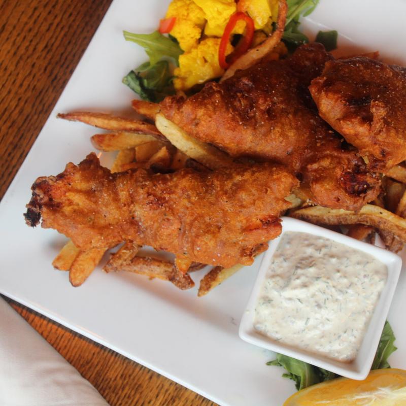 Curry Marinated Haddock/ Beer battered/ House cut beef tallow fries/ Lemon caper tarter sauce/ Dill pickles